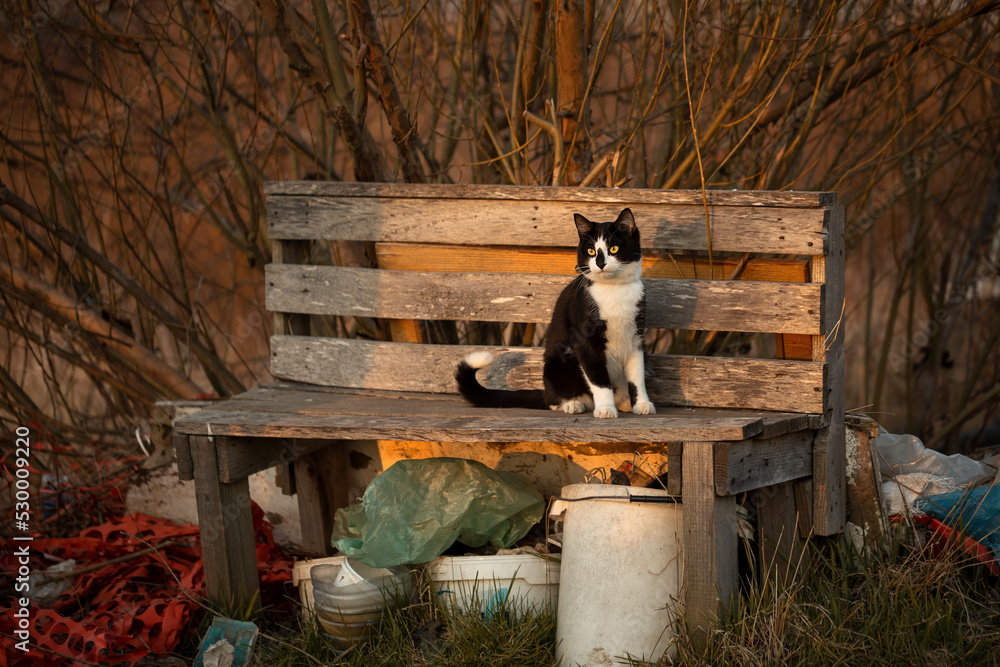 A black and white cat sits on a bench in the countryside at sunset.