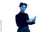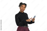 Thoughtful African American woman with phone. Female model in turtleneck with curly hair holding mobile phone in studio. Portrait, studio shot, emotion concept