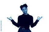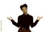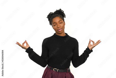 African American woman meditating in studio. Female model in black long sleeve shirt and trousers with closed eyes. Portrait, studio shot, gesture concept