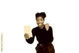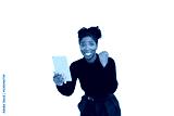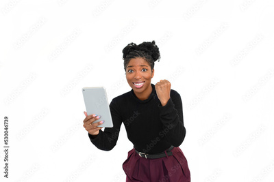 Content African American woman in studio. Female model in turtleneck with curly hair using tablet. Portrait, emotion, technology concept