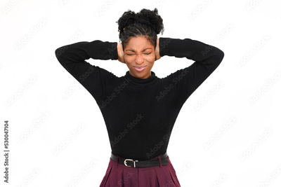 Annoyed African American woman in studio. Female model in black long sleeve shirt and trousers covering ears and closing eyes. Portrait, studio shot, emotion concept