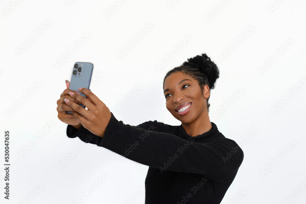 Happy African American woman with phone. Female model in turtleneck with curly hair taking selfie in studio. Portrait, studio shot, emotion concept