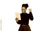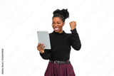 Contented African American woman in studio. Female model in turtleneck with curly hair using tablet. Portrait, emotion, technology concept