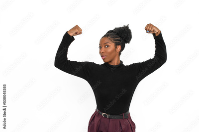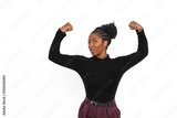 Portrait of merry African American woman. Female model in turtleneck with curly hair looking at camera, gesturing. Portrait, studio shot, emotion concept