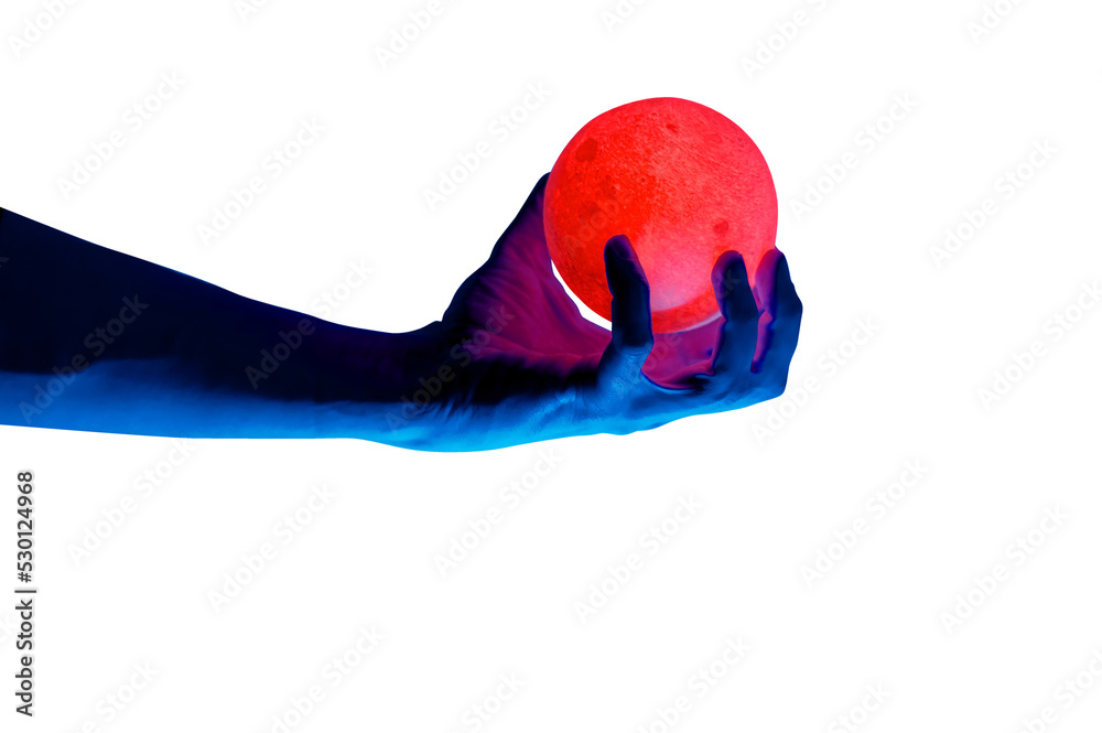Human migician hand holding red illuminated sphere. Surrealistic collage element, contemporary art for design, posters and banners. Neon purple light. Pop fantasy style