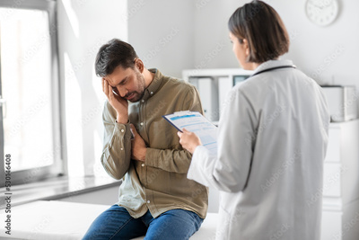 medicine, healthcare and people concept - female doctor with clipboard and sad male patient having health problem at hospital