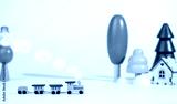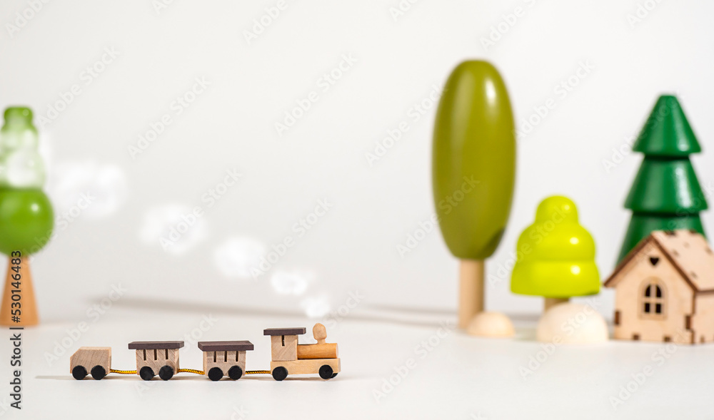 A small wooden locomotive on the background of wooden trees. Travel concept. Eco-friendly wooden toys.