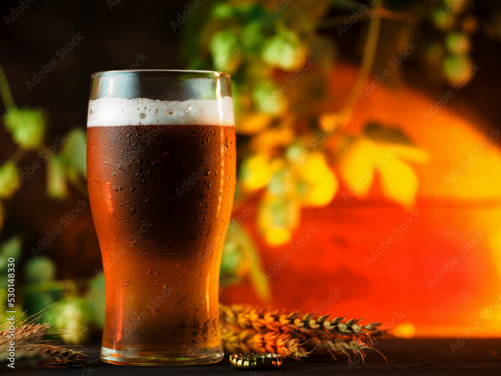 A glass of cold light beer in drops of water and green cones of hops. Wooden background. Oktoberfest background