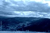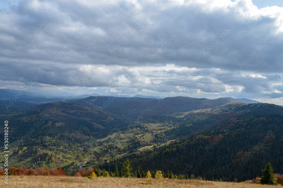 Picturesque autumn scenery village in the mountain slopes with colorful trees and meadows. Carpathian Mountains, Ukraine