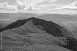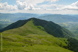 The view of green slope and forest on mountain ridge in summer day. Carpathian Mountains, Ukraine