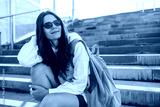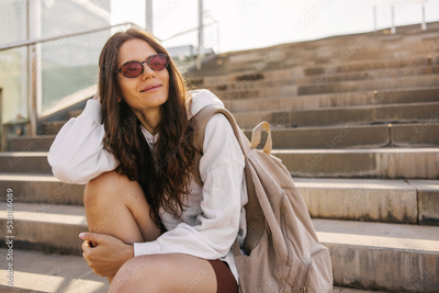 Picture of cheerful smiling woman touching hair and sitting at stairs outdoors. In sunglasses, with backpack keep hand on leg. Rest time concept