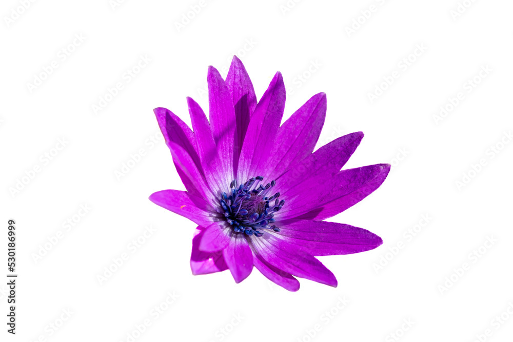 Purple single flower on white background. Broad-leaved Anemone (Anemone hortensis).
