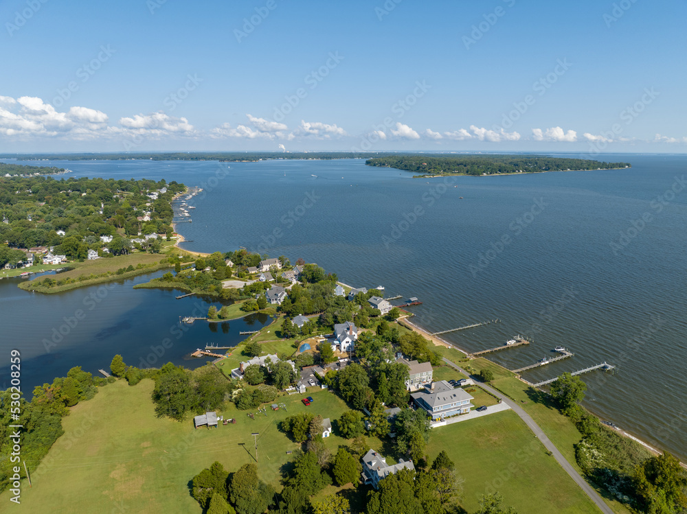 Aerial view of Chesapeake Bay coastline with Magothy river, Gibson island and luxury houses