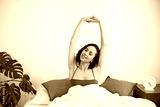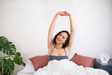 A young multi-ethnic woman stretches in bed waking up in the morning