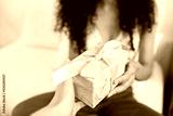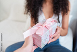 Close up of hand giving pretty gift wrapped in pink bow in bed