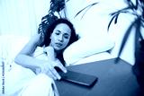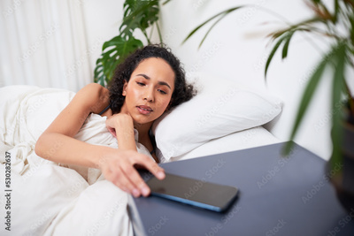 A young multi-ethnic woman reaches for cellphone when she wakes up in bed