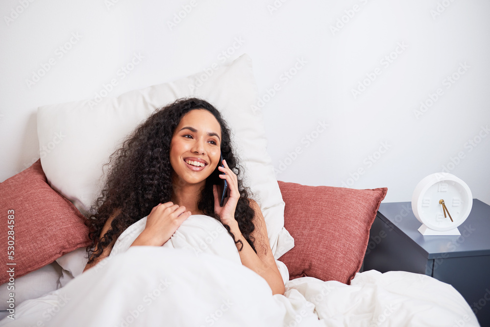 A young multi-ethnic woman laughs during intimate long distance call from bed