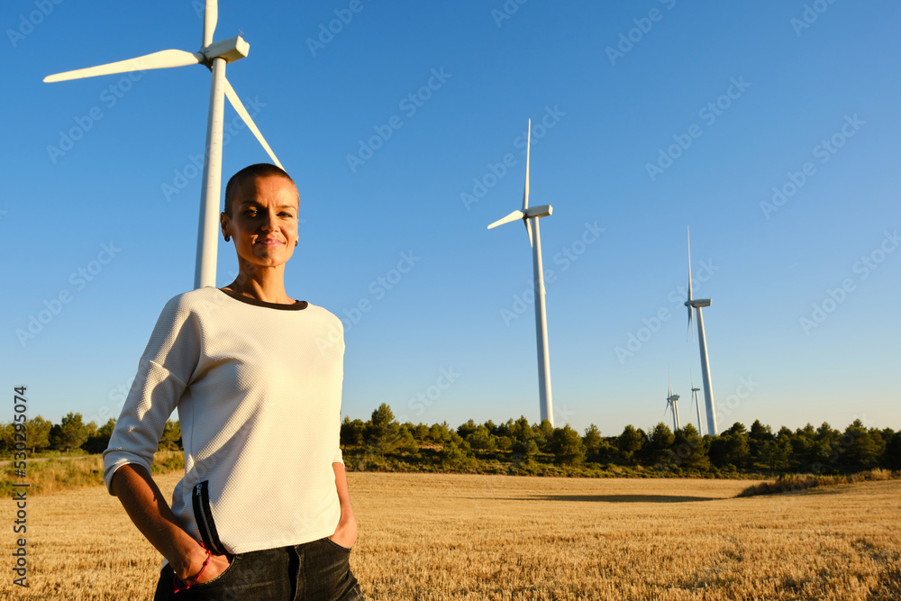 Woman looking at the camera while standing in wind turbines field with windmills behind her.