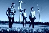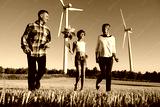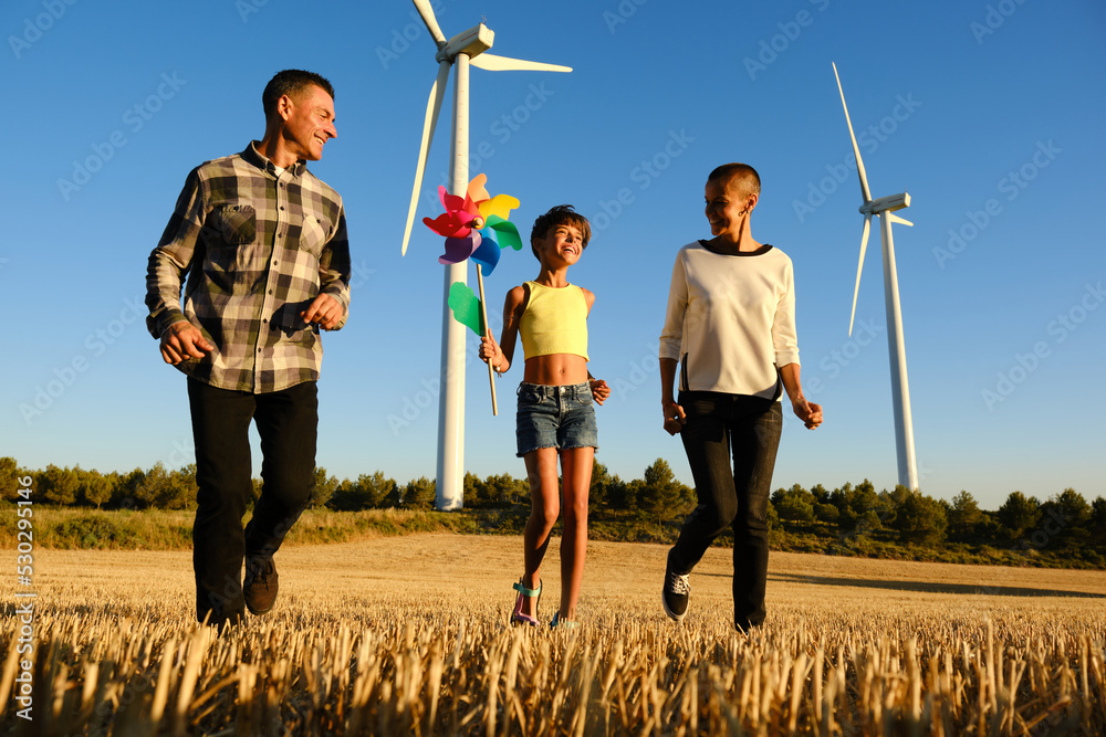Girl playing with a wind turbine toy while having fun with her parents in wind turbines field.