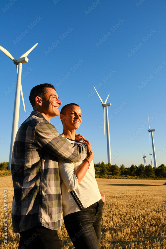 Couple looking away and smiling while standing together outdoors in wind turbines field.