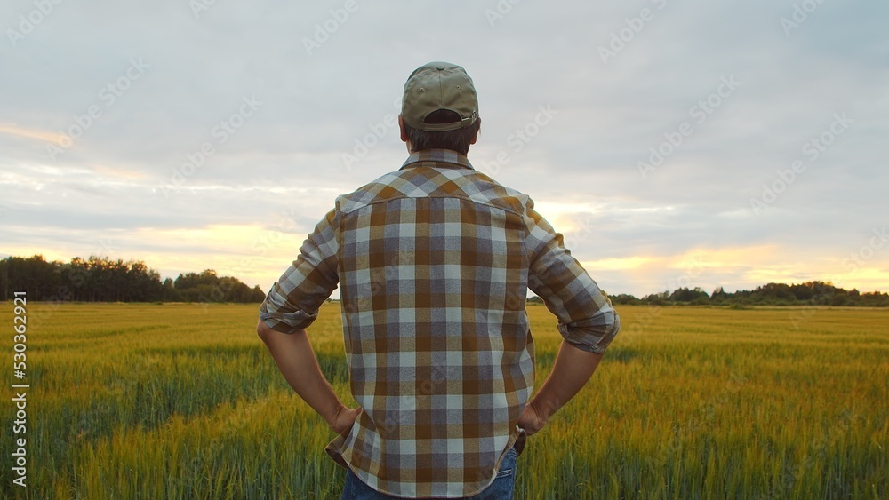 Farmer in front of a sunset agricultural landscape. Man in a countryside field. Country life, food production, farming and country lifestyle.