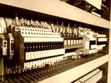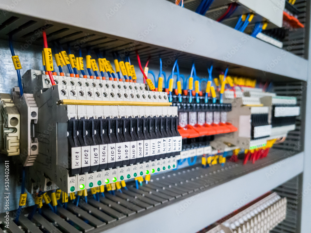 Row of fuses and relays installed in electrical cabinet automation system in industrial plant.