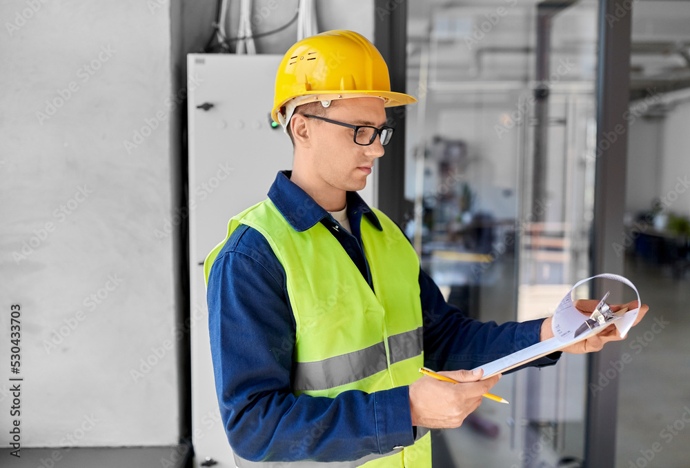 construction business and building concept - male electrician or worker in helmet and safety west with papers on clipboard and pencil at electric board
