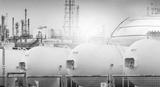 Industrial gas storage tank. LNG or liquefied natural gas storage tank. Energy price crisis. Gas tank in petroleum refinery. Energy crisis. Natural gas storage industry and global market consumption.