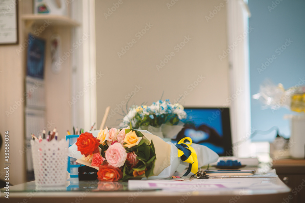 A bouquet of flowers on the teacher's desk with a yellow and blue ribbon