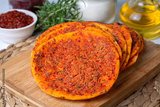 Traditional Turkish Biberli Ekmek “Flat bread with red pepper paste” being prepared before cooking in Antakya Hatay, Turkey (Antakya katik)