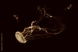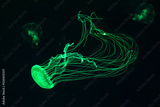 Fluorescent green jellyfish swimming underwater aquarium pool. The Atlantic sea nettle chrysaora quinquecirrha in black water, ocean. Theriology, tourism, diving, undersea life.