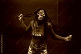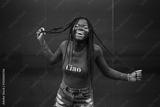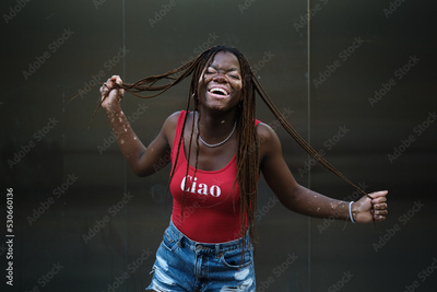 Happy African American woman with vitiligo laughing while holding her hair braids.