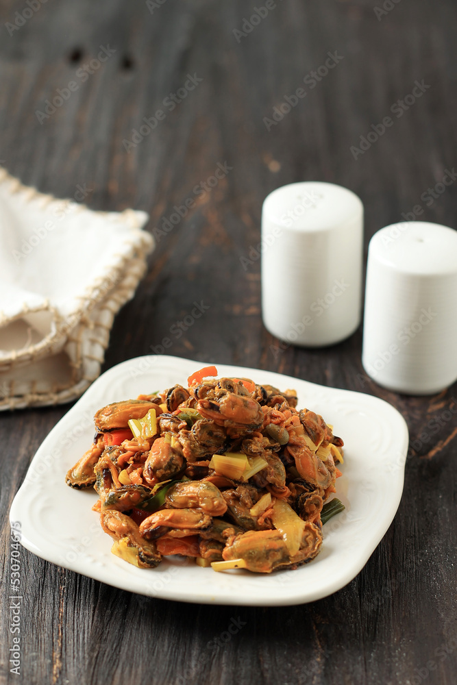 Tumis Kerang or Oseng Kerang, Stir Fried Oyster with Chilli, Garlic, Red Onion, and Other Various Spices.