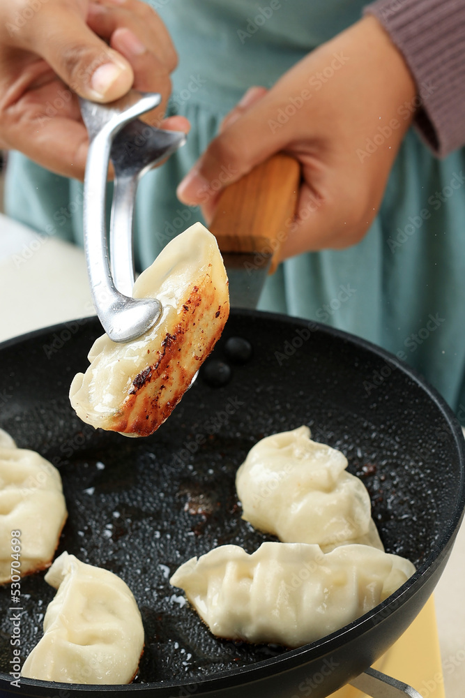 Cooking Gyoza, Japanese Dumpling stuffed with Beef, Pork, Chiken, and Chopped Vegetable