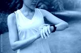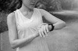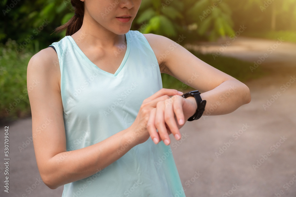 Runner woman checking fitness progress and tracker activity on her smart watch.