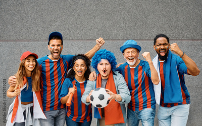 Multiracial group of excited soccer fans cheering during championship and looking at camera.