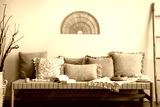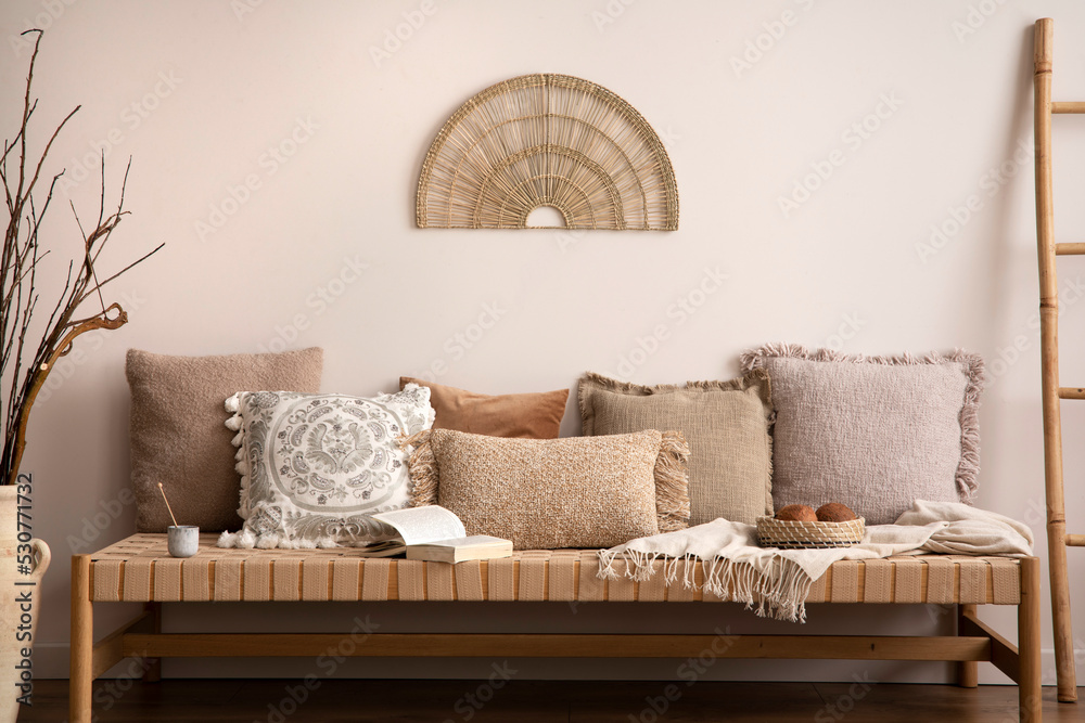 Boho and cozy interior of meditation room with beige chaise lounge, pillows, ladder, rattan decoration, books and personal accessories. Warm home decor. Template.