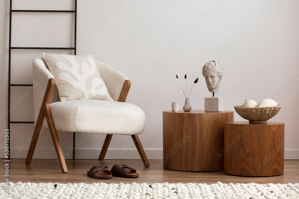 Interior design of retro and elegant living room with design boucle armchair, side table, furniture, decoration, vases, carpet and personal accessories. Template. Stylish home decor.