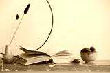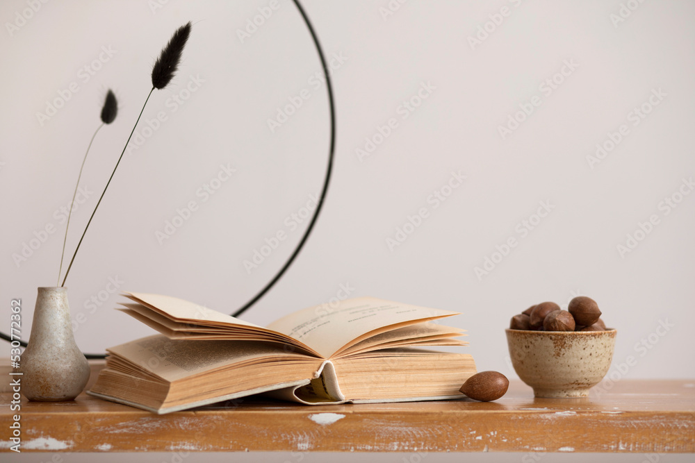 Minimalist composition of wooden bench with book, vase with dried flower, nuts and personal accessories. Copy space. Template.