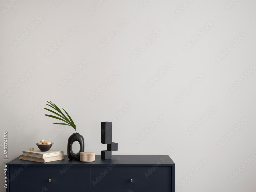 Minimalist composition of elegant and outstanding space with copy space, blue commode, leaves in vase and personal accessories. Home decor. Template.