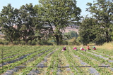 women pruning strawberry seedlings in a strawberry field, women working in the field with traditional clothes