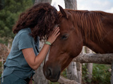 Close up of brunette woman forming bond with an anglo- arab horse behind a wood fence in a field.