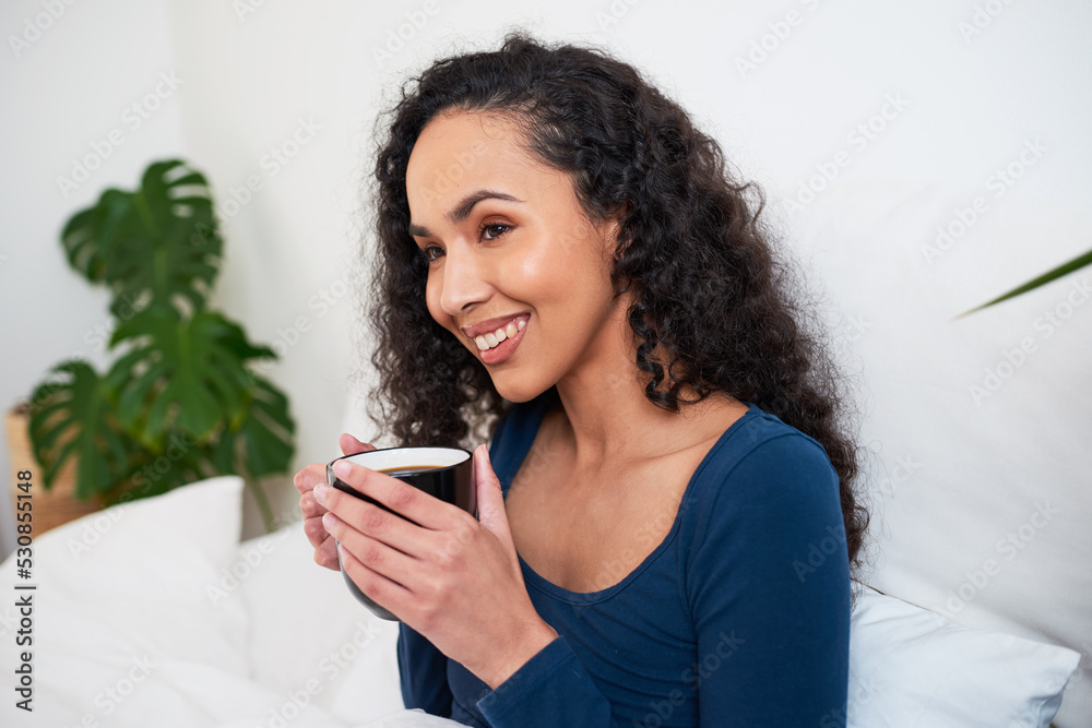 A happy young multi-ethnic woman wakes up by drinking coffee in bed