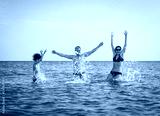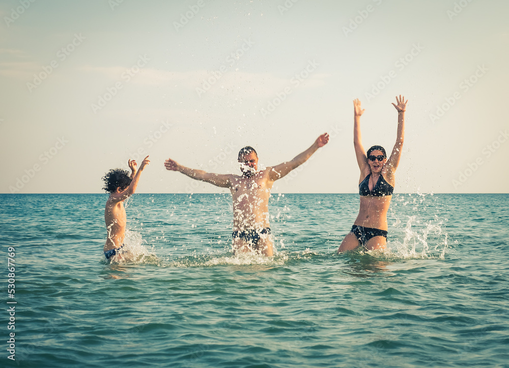 Dad, daughter and son bathe swimming in the sea and having fun together. Paternity concept