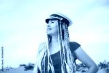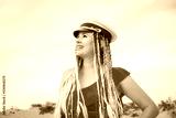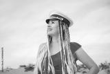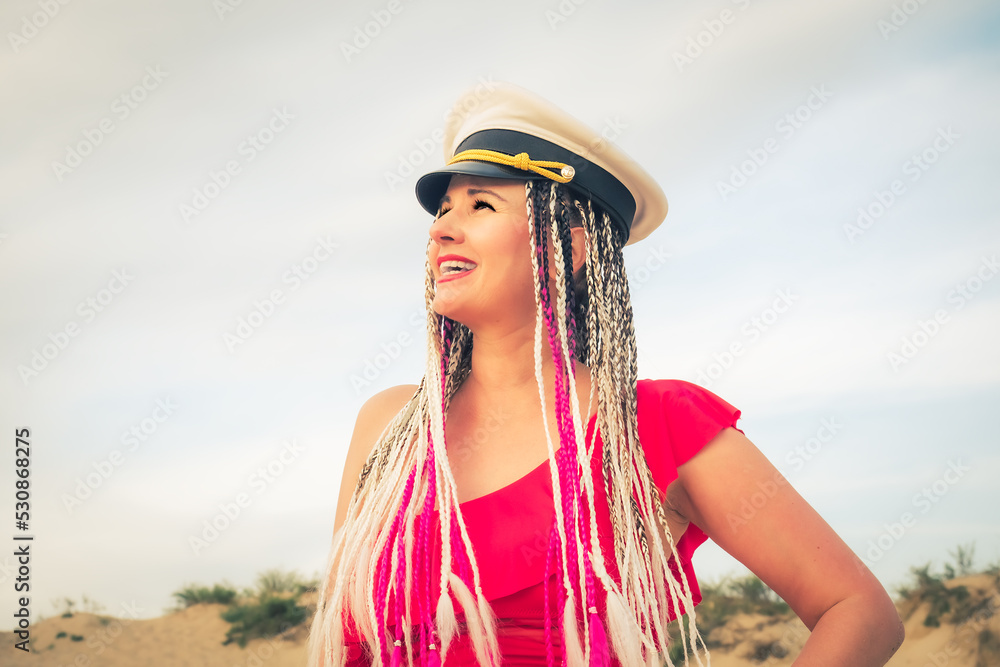 Beautiful middle-aged woman with dreadlocks, with long hair excited joyfully on the beach
