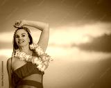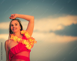 Happy middle aged woman in red swimsuit laughing and having fun sunset at the beach