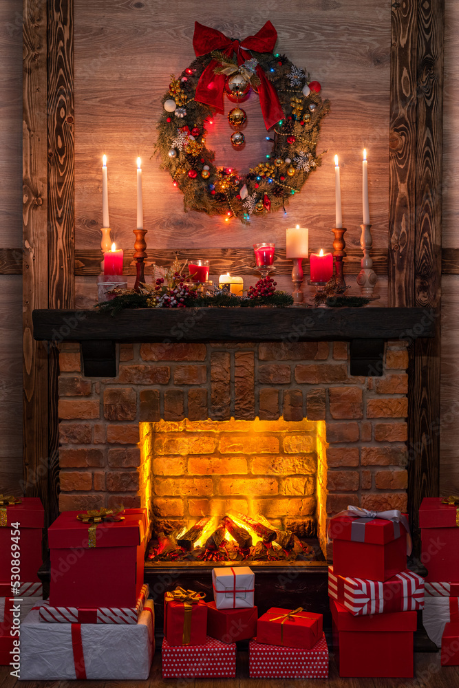 Many gift boxes near the Christmas fireplace in a festive interior of a Log Cabins with wooden walls. Mantelpiece with candles, Christmas wreath with bells