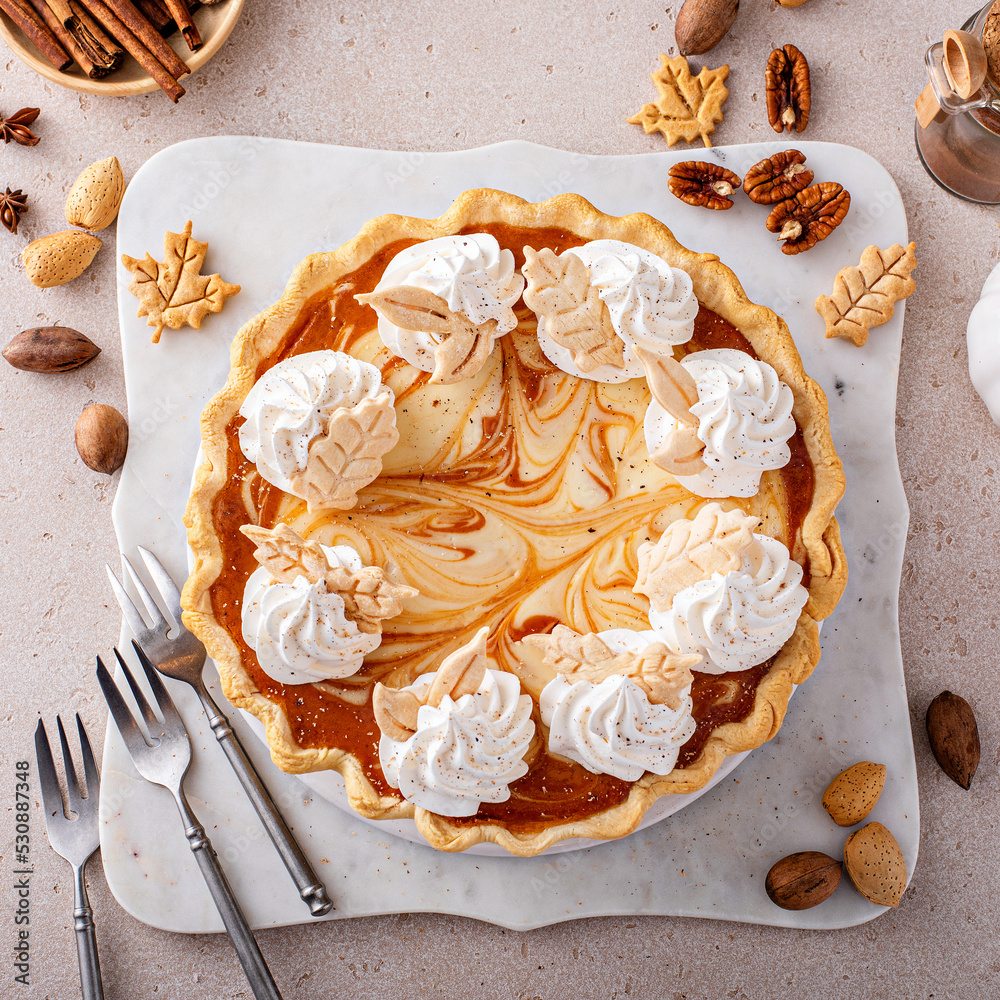 Pumpkin cheesecake swirl pie topped with whipped cream