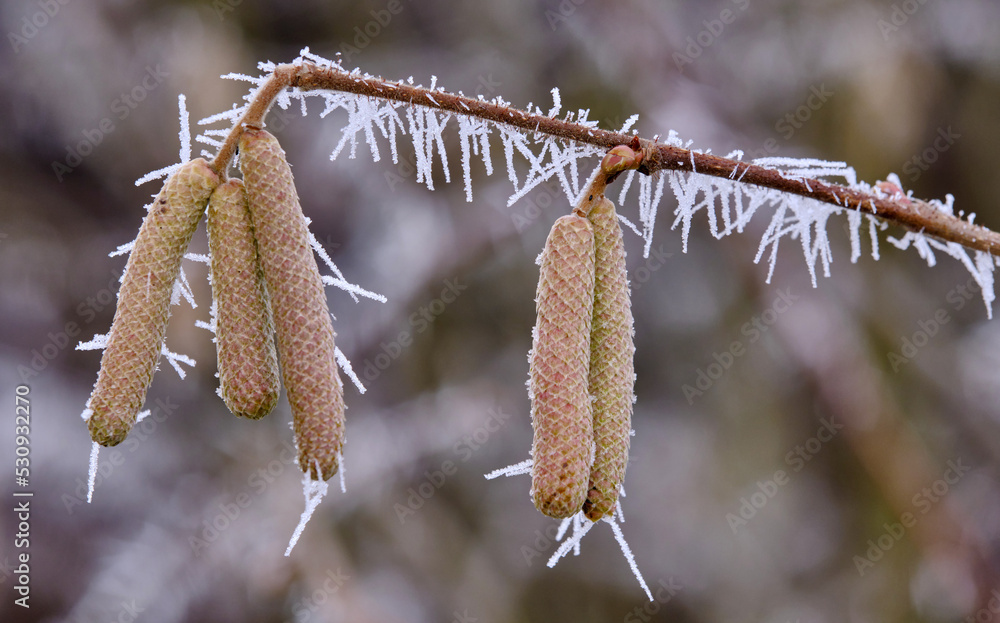 Spiky rime ice covers hazel catkins. Ice needles on a hazel branch. Hoarfrost crystals coating hazel catkins. Crystallized tree branch.