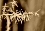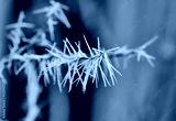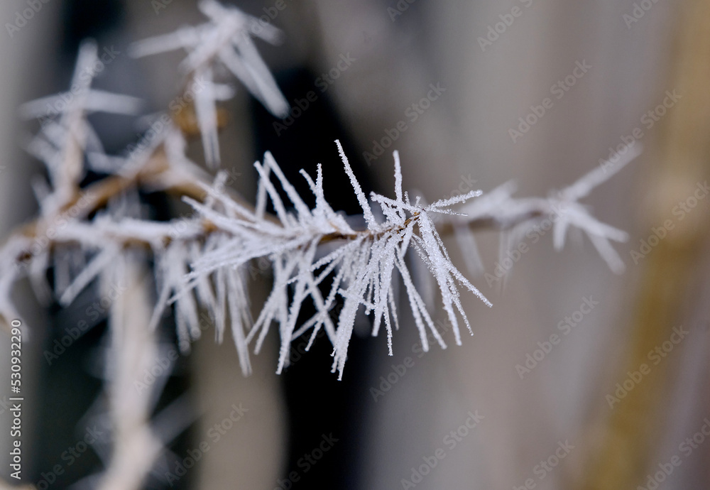 Spiky rime ice covers a branch on soft background. Ice needles on a branch. Hoarfrost crystals coating a branch. Crystallized tree branch.